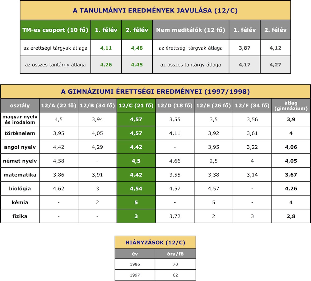 A 11.c.-ben meditáltak a legtöbben, az osztály fele tanulta meg a TM-et, ebben az osztályban méréseket, megfigyeléseket is végeztek a gyerekek a tanárnővel közösen. Ezek az eredmények igazolták mindazt a változást, amit a világ számtalan országában is mértek: